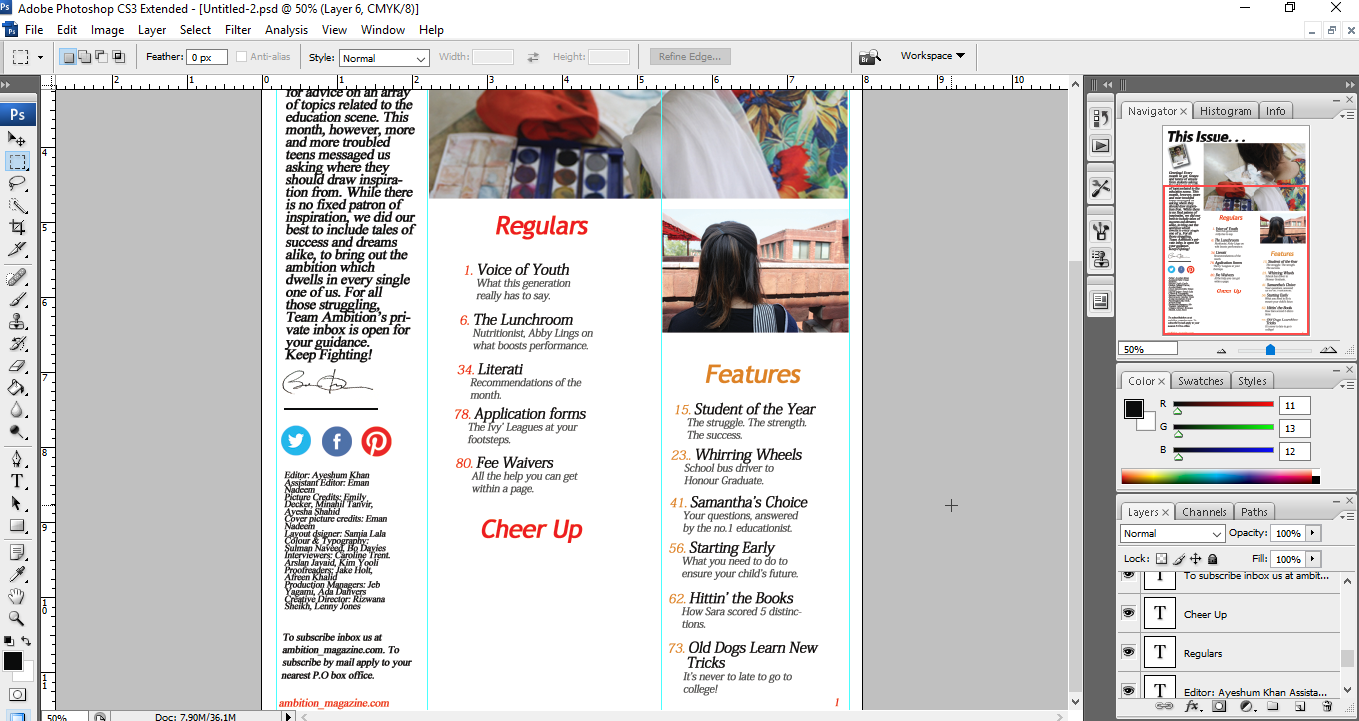I continued by adjusting a subscription offer under the credits with enough space to differentiate between the two bodies of text. I also used a smaller font for this as it is information a reader would not be looking for at first glance like the magazine's email address. This inspired me to add the email address to the footer on the left side in red in accordance to the colour scheme of the magazine. I added the page number in red on the right bottom corner.